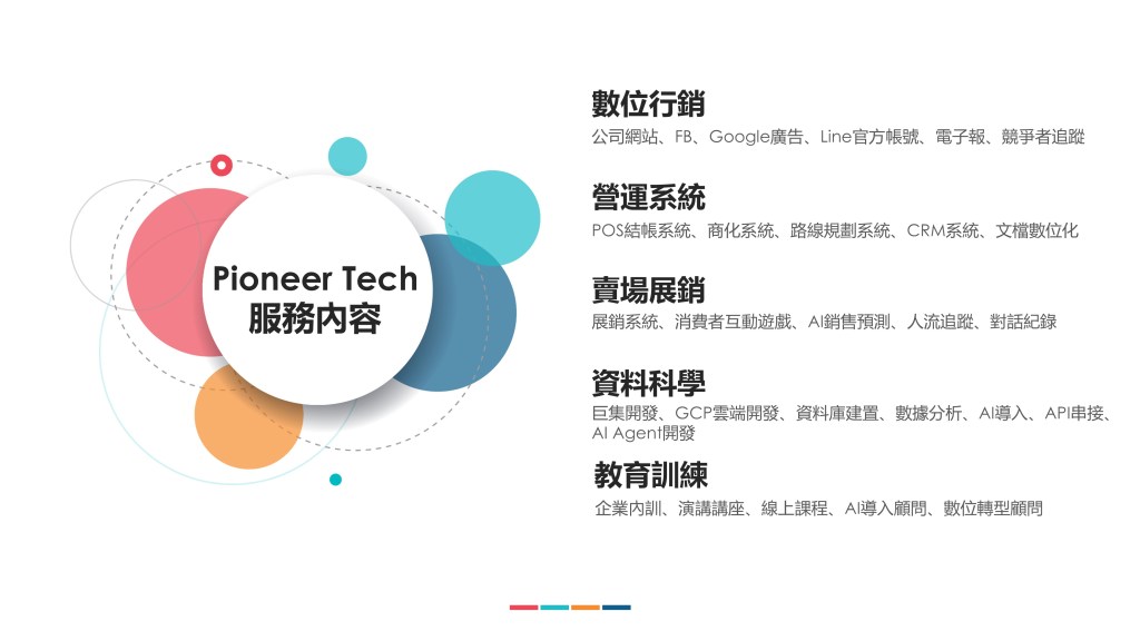 專注於協助品牌與通路進行數位轉型,整合數位行銷、系統開發與AI導入,提供從行銷推廣、商化與展銷執行,到 POS、CRM、路線規劃與 AI 銷售預測的一站式解決方案。我們以高度客製化的系統與數據驅動的方法,幫助企業即時掌握營運狀況、優化決策流程並放大商業成效,成為品牌在零售與行銷科技領域中最值得信賴的合作夥伴。